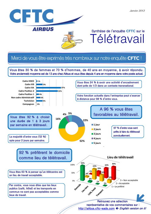 Le 20 novembre 2012 la CFTC a lancé une enquête auprès des salariés dont les résultats ont été mis en ligne en janvier 2013. Ils montrent que 96% des salariés qui ont répondu sont intéressés par le télétravail. Leur lieu préféré pour le télétravail est le domicile à raison d’une moyenne de 2 jours par semaine. Ces résultats sont repris par la CFDT qui demande l’ouverture de négociations à EADS. Ce même tract de la CFDT précise la différence entre le nomadisme et la télétravail.